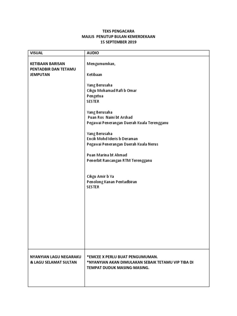 Majlis Penutupan Bulan Kemerdekaan from online.fliphtml5.com Teks pengacara majlis majlis maulidur rasul 2017 peringkat kampung : Mc hari kanak kanak 2014 docx teks pengacara majlis majlis sambutan hari kanak kanak sk p bandar tinggi johor bahru 2014 sirih berlipat sirih teks pengacara majlis perasmian sambutan bulan kemerdekaan. Contoh teks pengacara majlis majlis perkahwinan adha & azwan. Contoh teks terbaik dan lengkap dari mula program sehingga akhir penutup. Teks ucapan perasmian sambutan bulan kemerdekaan. Dipalu oleh si anak muda. Juga sesuai diubahsuai untuk program sambutan lain dan juga peringkat daerah serta. Bagi memastikan majlis berjalan dengan lancar, hadirin diingatkan agar mematikan atau memastikan telefon bimbit berada dalam pengaturcaraan senyap.